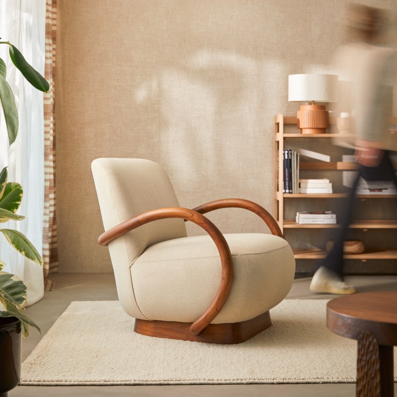 Drehsessel aus massivem Mindiholz mit naturfarbenem Stoffbezug