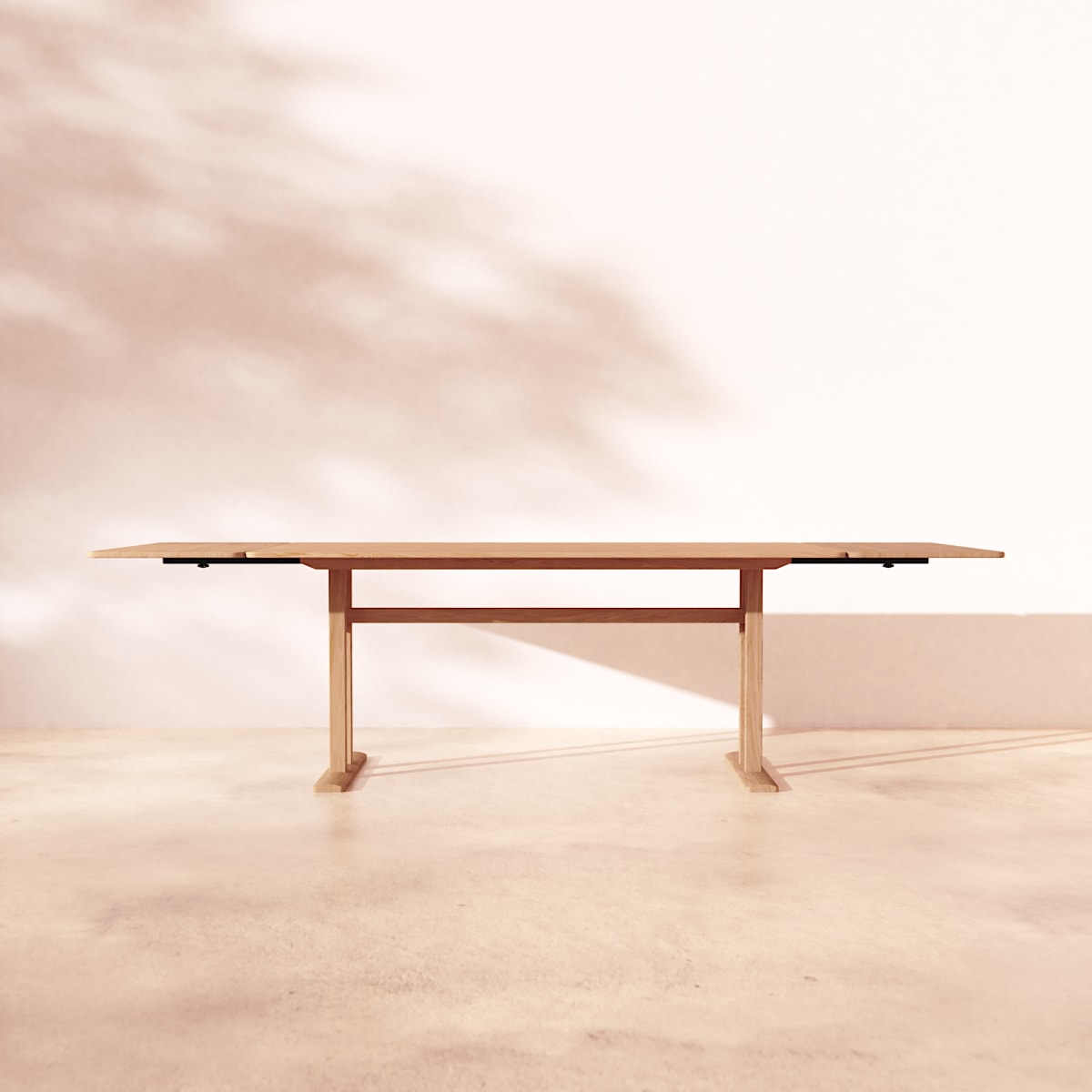 180 cm langer Tisch + 95 cm lange Verlängerung (2 Verlängerungsplatten von je 47,5 cm, die an den Enden des Tisches eingeklappt werden).