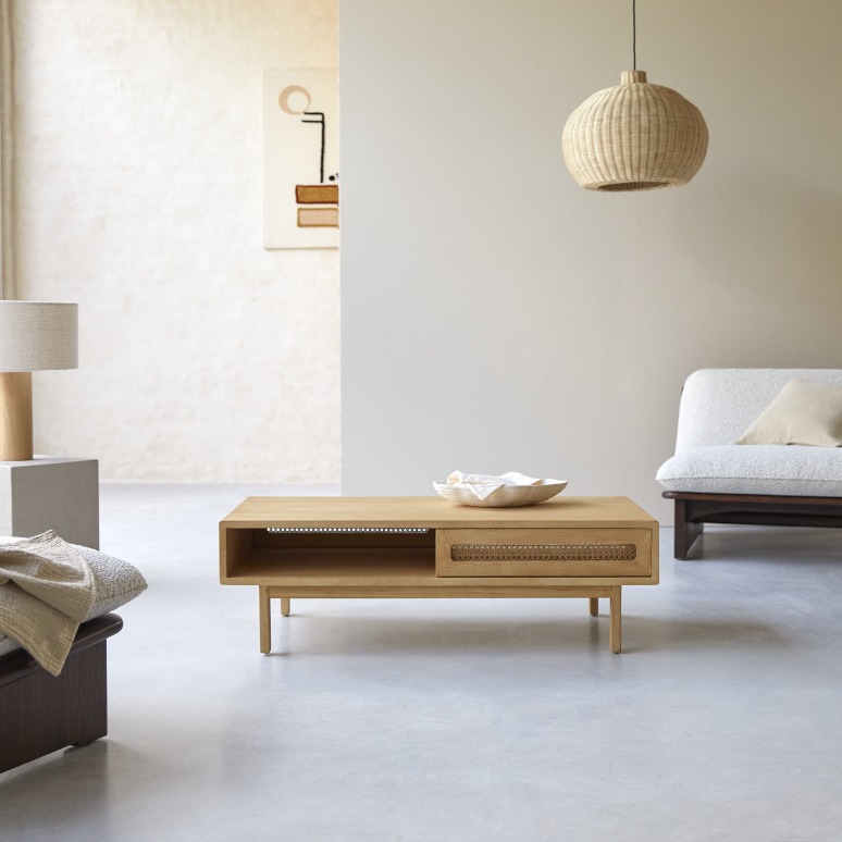 Couchtisch aus massivem Ulme und Rattangeflecht