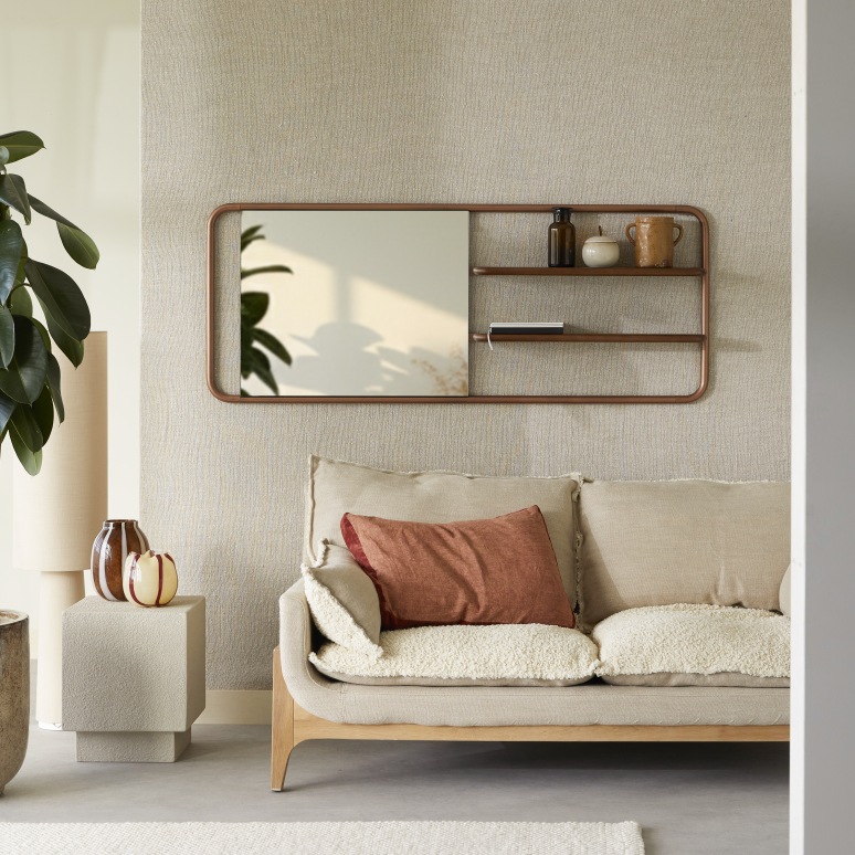Regalspiegel aus Walnussholz und Messing