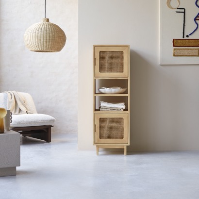 Der Hochschrank Luis aus massiver Ulme und Rattangeflecht.