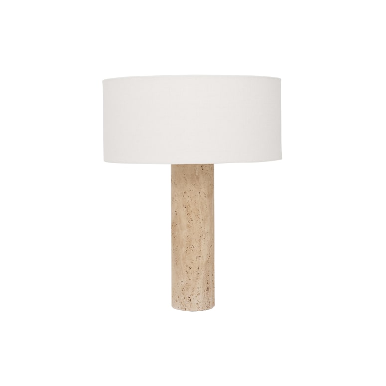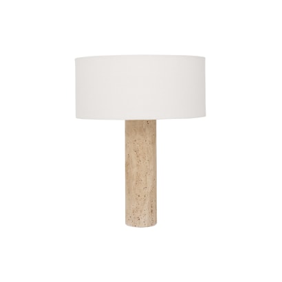 Lampenschirm aus Baumwolle, Lampenfuß aus Travertin.
